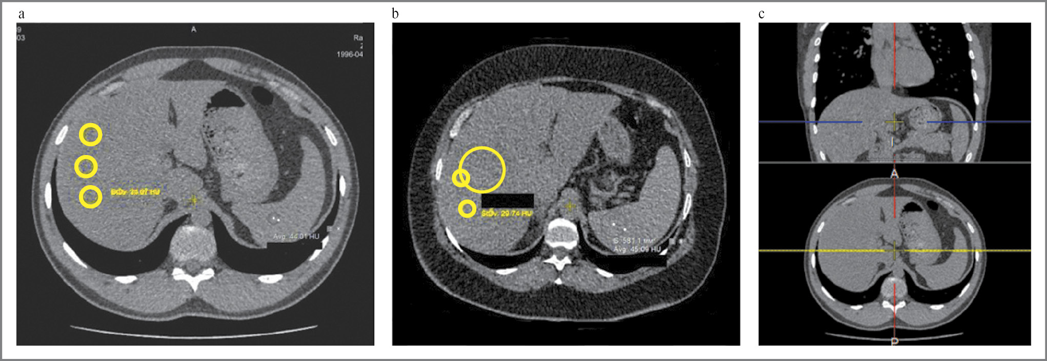 3. Fig. 2. Axial сomputed tomograms (CТ) without contrast in the liver and spleen. The areas of interest (ROI) are highlighted in a yellow circle: а – male, 25 years old, CТL – 34 HU, CТS – 44 HU; b – female, 56 years old, CТL – 29 HU, CТS – 45 HU; c – the liver area almost completely falls into the section during chest CT scan.