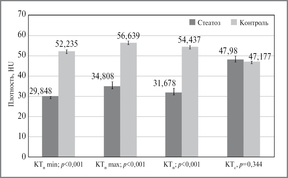 Для выбора статистического критерия оценки количественных переменных предварительно проведено сравнение их распределения с нормальным (отдельно для каждой из групп) с использованием критерия Колмогорова–Смирнова. При нормальном распределении для оценки статистической значимости различий применен критерий Стьюдента. Если распределение параметра хотя бы в одной из групп статистически значимо отличалось от нормального, то выбирали критерий Манна–Уитни. Значения нормально распределенных переменных представлено как среднее арифметическое значение (М) ± стандартное отклонение (SD). При несоответствии распределения переменной нормальному значение переменных представлено как медиана (Ме) и 25 и 75-й квартили. Для оценки статистической значимости различий значений качественных переменных применяли критерий χ2 или точный критерий Фишера (если более чем в 25% ячеек ожидаемые значения были меньше 5). Для оценки связи между плотностью печени и HSI использовали регрессионный анализ с построением уравнения линейной регрессии и коэффициент корреляции Спирмена ρ. За уровень значимости принято р ≤ 0,05. Статистический анализ проводили с помощью программы SPSS версии 22.
