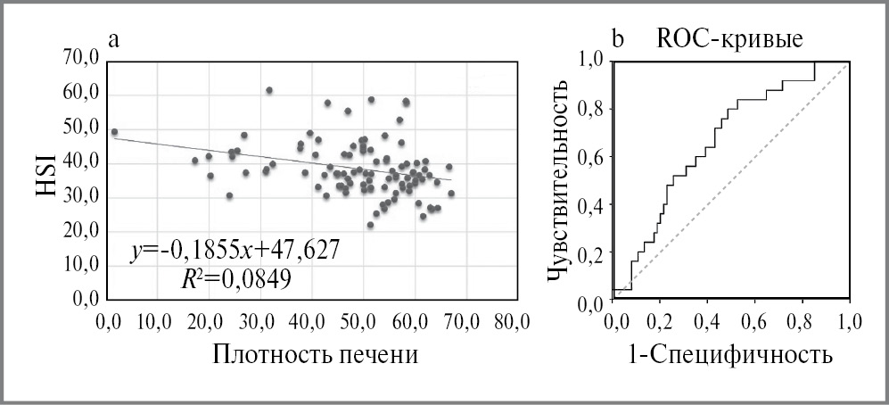 5. Fig. 4. Diagnostic efficacy of HSI in liver steatosis in patients with non-alcoholic fatty liver disease and viral pneumonia compared with liver density according to CT data: a – scatter plots of HSI level as a function of HU liver, solid lines represent best-fit linear regression; b – receiver operating characteristics curves showing the performance of HSI in the diagnosis of hepatic steatosis using CT criteria.
