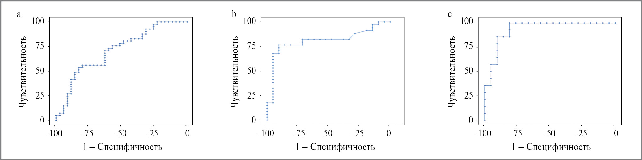 Рис. 1. ROC-анализ и площадь под кривой (AUC) при определение антител к нефрину (а), синаптоподину (b) и нефрину и синаптоподину (с) у больных подоцитопатиями.