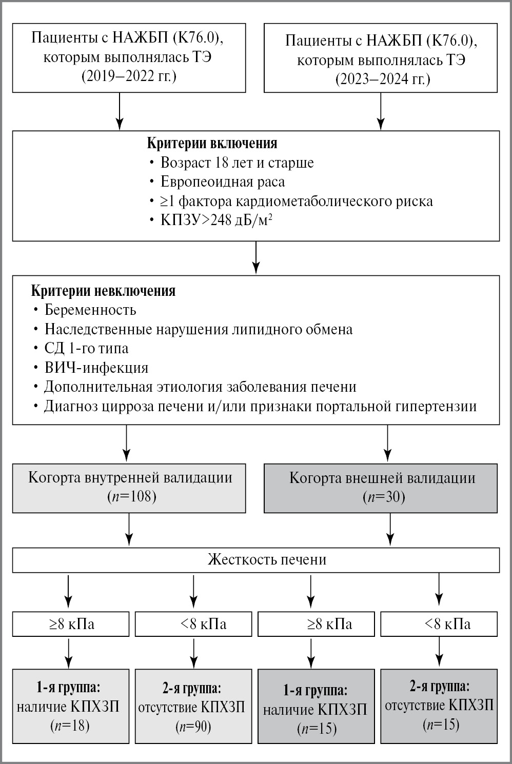 Проведено ретроспективное обсервационное исследование. Для создания группы внутренней валидации проанализированы карты 423 пациентов с диагнозом НАЖБП (К76.0), проходивших обследование в условиях Клиники высоких медицинских технологий им. Н.И. Пирогова ФГБОУ ВО СПбГУ в период с 2019 по 2022 г., подробные данные о формировании группы внутренней валидации опубликованы нами ранее [21]. Из 423 участников критериям включения соответствовали 108 человек (33 мужчины и 75 женщин). Для внешней валидации модели отобрано 30 амбулаторных карт пациентов с МАЖБП (9 мужчин и 21 женщина), проходивших обследование в условиях этой же клиники в период с 2023 по 2024 г. Средний возраст исследуемых группы внутренней валидации составил 61,2±14,1 года, группы внешней валидации – 59,4±12,2 года. Изучались анамнестические данные: уделялось особое внимание наличию в анамнезе артериальной гипертензии (АГ), сахарного диабета 2-го типа (СД 2), дислипидемии [под фактором риска дислипидемии принимался уровень триглицеридов – ТГ ≥1,7 ммоль/л или прием липидснижающей терапии; уровень липопротеидов высокой плотности ≤1,0 ммоль/л (у мужчин) и ≤1,3 ммоль/л (у женщин) или прием липидснижающей терапии]; оценивались росто-весовые показатели, индекс массы тела (для классификации использовались критерии Всемирной организации здравоохранения 1997 г., где значения индекса ≥30 кг/м2 расценивались как наличие ожирения), окружность талии (ОТ). У всех пациентов определен уровень тромбоцитов, сывороточных показателей состояния печени (аланинаминотрансферазы – АЛТ, аспартатаминотрансферазы – АСТ, γ-глутамилтрансферазы – ГГТ, щелочной фосфатазы – ЩФ, билирубина), липидный спектр и уровень глюкозы. Полиморфизм гена Patatin-Like Phospholipase Domain Containing 3 (PNPLA3) I148M (rs738409 C>G) определялся методом полимеразной цепной реакции в образцах слюны (набор «ТестГен», Россия) в лаборатории диагностики аутоиммунных заболеваний Научно-методического центра Минздрава России по молекулярной медицине (ФГБОУ ВО «Первый СПб ГМУ им. акад. И.П. Павлова»). Оценка жесткости печени и выраженности стеатоза выполнялась на аппарате «Фиброскан 502 TOUCH» (Echosens, Франция) с функцией контролируемого параметра затухания ультразвука (КПЗУ). Диагноз МАЖБП установлен на основании выявленного стеатоза по данным ТЭ с функцией КПЗУ и наличии хотя бы одного кардиометаболического фактора риска: индекс массы тела ≥25 кг/м2 или ОТ>94 см у мужчин и >80 см у женщин; уровень глюкозы натощак ≥5,6 ммоль/л или ≥7,8 ммоль/л через 2 ч после углеводной нагрузки в плазме венозной крови, или уровень гликированного гемоглобина ≥5,7%, или наличие СД 2; артериальное давление ≥130/85 мм рт. ст. или прием антигипертензивной терапии; уровень ТГ≥1,7 ммоль/л или прием липидснижающей терапии; уровень липопротеидов высокой плотности ≤1,0 ммоль/л (у мужчин) и ≤1,3 ммоль/л (у женщин) или прием липидснижающей терапии. КПХЗП устанавливалось при жесткости печени ≥8,0 кПа, таким образом, среднее значение жесткости печени в основной группе (1-я группа) составило 10,92±3,69 кПа, а в группе сравнения (2-я группа) – 5,53±1,08 кПа. Все пациенты принадлежали к европеоидной расе, у них исключены другие причины стеатоза печени (алкогольный генез и жировая болезнь печени специфического генеза) и иные заболевания печени (вирусные, аутоиммунные и пр.); лица с сочетанным генезом стеатоза и фиброза печени, ранее установленным ди