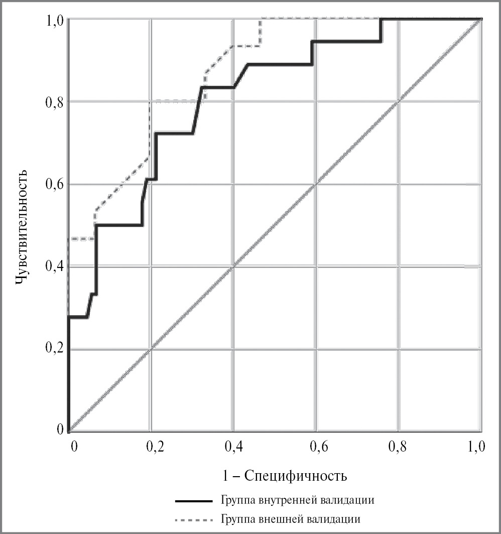 Площадь под ROC-кривой группы внешней валидации составила 0,87±0,06 (95% ДИ 0,75–0,99). Однако при использовании ранее определенного порогового значения логистической функции (р=0,192) отмечается высокая чувствительность – 100%, но низкая специфичность модели – 53,3%, точность – 76,7%. Полученные данные свидетельствуют о необходимости дальнейшей валидации прогностической модели на более широкой выборке пациентов с целью определения оптимального порогового значения выявления КПХЗП. Сравнительные данные анализа ROC-кривых групп внутренней и внешней валидации представлены на рис. 2.