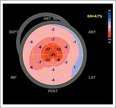 Fig. 1. Typical pattern of echocardiography speckle-tracking in a patient with amyloid cardiomyopathy (ACM) with a decrease in the global longitudinal strain of the basal and middle segments of the LV (pale blue and pink) with preserved strain of the apical segments (red).