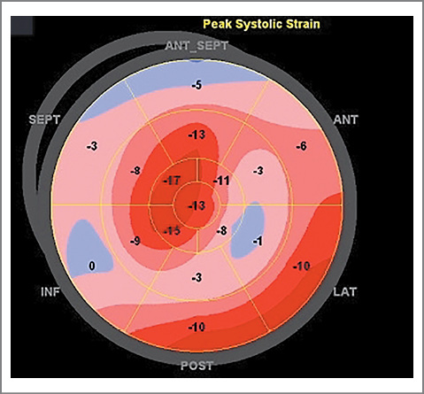 Рис. 2. Картина спекл-трекинг ЭхоКГ при ГКМП. Определяется снижение глобальной продольной деформации ЛЖ как в базальных, так и в верхушечных сегментах.