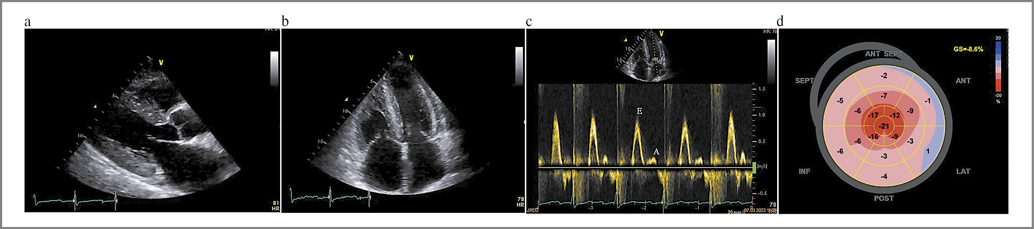 Fig. 4. Clinical case 1. Patient A. with AL-amyloidosis of the HP+RP phenotype: a, b – biventricular thickening of the walls with a specific "luminous" structure and atrial cavity dilation; c – restrictive impairment of LV diastolic function (E/A>2); d – a typical pattern of impaired LV global longitudinal strain with a basal-apical gradient.