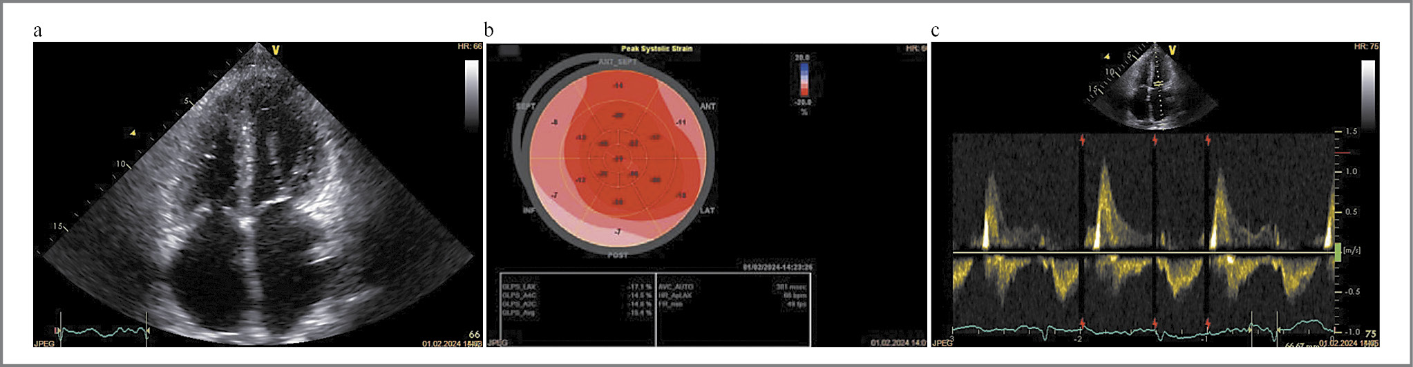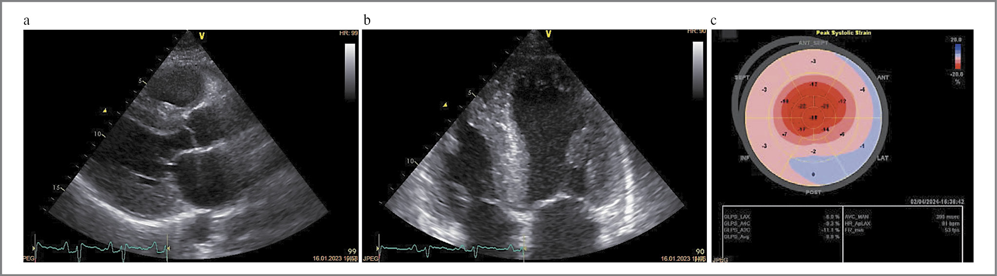 Fig. 5. Clinical case 3. Patient M. with HP AL-amyloidosis: a–c – pronounced thickening of the LV myocardial walls with a typical pattern of impaired LV global longitudinal strain.