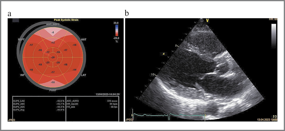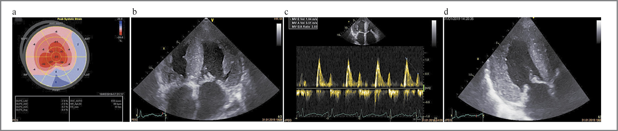 Рис. 4. Клинический пример 1. Пациент А. с AL-амилоидозом фенотипа ГФ+РФ: a, b – бивентрикулярное утолщение стенок со специфической «светящейся» структурой, дилатация полостей предсердий; c – рестриктивное нарушение диастолической функции ЛЖ (E/A>2); d – характерный паттерн нарушения глобальной продольной деформации ЛЖ в виде базально-апикального градиента.