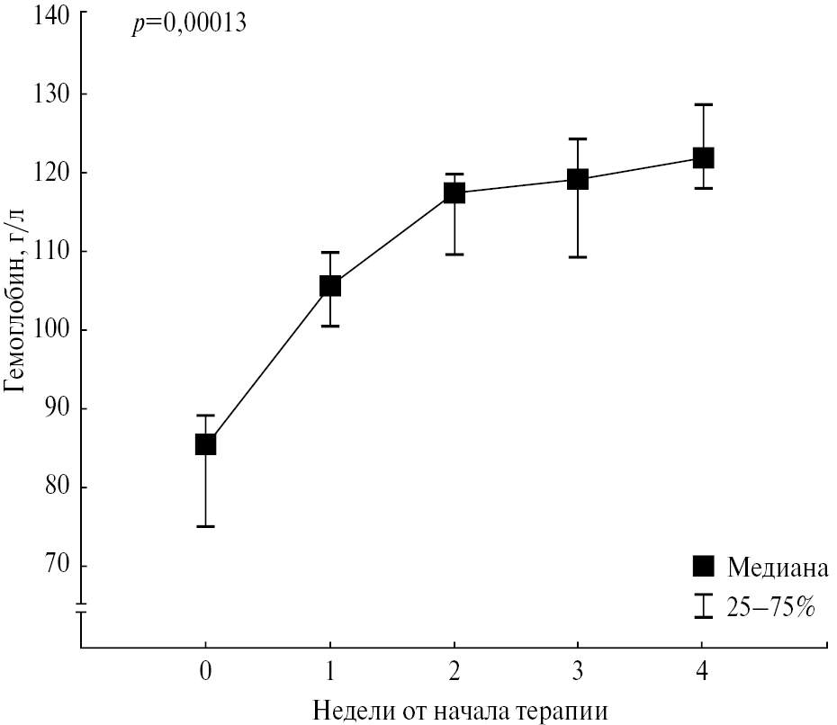 Первичными конечными точками анализа были повышение уровня гемоглобина более 20 г/л от исходного и достижение уровня гемоглобина более 120 г/л без трансфузий через 4 нед лечения. Вторичными конечными точками являлись улучшение среднего балла по шкале FACIT-F, отсутствие повышения уровня ЛДГ>1,5 норм и новых тромботических осложнений, отсутствие НЯ, требующих прерывания лечения.