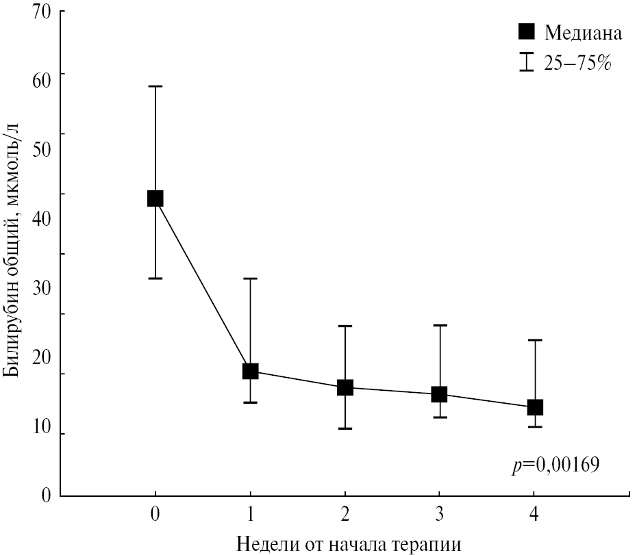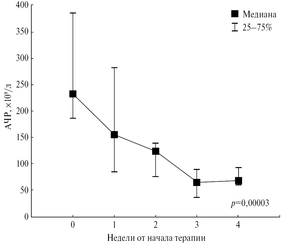 При анализе во всей когорте через 4 нед терапии иптакопаном медиана АЧР уменьшилась на 160×109/л с исходной 232×109/л (98–529) до 68×109/л (34–104); p=0,00003. Аналогично медиана уровня общего билирубина снизилась на 32,6 мкмоль/л с 43,3 (16–87,4) до 12,9 мкмоль/л (7,8–35,5); p=0,00169. Уровень ЛДГ у всех пациентов не превышал 1,5 ВГН во всех точках оценки со снижением с исходного 213 Ед/л (110–313) до 172 Ед/л (86–216); p=0,00382.