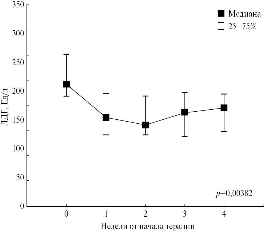 Рис. 4. Уровень ЛДГ в течение 4 нед терапии иптакопаном.