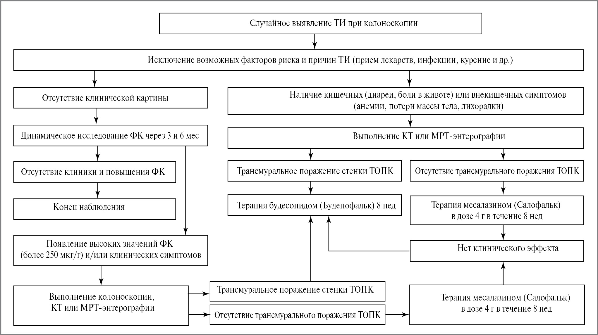 Необходимость наблюдения диктуется невозможностью достоверного разграничения ИТИ от БК, которая может манифестировать через несколько месяцев или даже лет [41]. При наличии трансмурального поражения стенки кишки, симптомов, согласующихся с БК (анемия, высокие показатели ФК – свыше 250 мкг/г, системный воспалительный процесс), может быть рассмотрено лечение, применяемое для БК. В случае отсутствия достоверных критериев БК у симптомных пациентов рекомендуется курс лечения месалазином. Оптимальными следует считать препараты месалазина с кишечнорастворимой оболочкой из эудрагита L. Индукционный курс целесообразно проводить в течение 8 нед, оптимальная доза месалазина – 4,0 г. При неэффективности лечения месалазином рекомендуется 2-я линия терапии будесонидом. Если у ранее бессимптомного пациента появляются кишечные или внекишечные симптомы, то необходимо определить уровень ФК, а при превышении его допустимого предела провести дообследования (посредством лучевых методов диагностики, колоноскопии) с целью исключения БК.