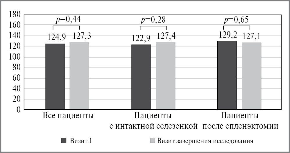 Концентрация гемоглобина на визите 1 в обеих группах пациентов находилась в пределах референсных значений и была сопоставимой. У пациентов с сохраненной селезенкой она была несколько выше на визите завершения исследования по сравнению с исходными данными, однако статистически значимой динамики среднего показателя концентрации гемоглобина между завершающим визитом и исходным уровнем не обнаружено. В группе пациентов после спленэктомии также не обнаружено статистически значимой динамики концентрации гемоглобина между завершающим визитом и исходным уровнем.