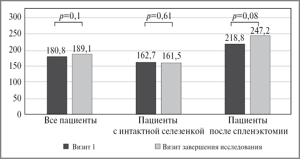 Проведенный анализ данных по изменению количества тромбоцитов на визите завершения исследования относительно исходного уровня показал, что в общей группе за счет спленэктомированных пациентов отмечена тенденция к увеличению количества тромбоцитов в ходе проводимого лечения до 189,1×109/л; p=0,1. В группе пациентов после спленэктомии также отмечена тенденция к увеличению количества тромбоцитов до 247,2×109/л; p=0,08. В группе пациентов с интактной селезенкой на завершающем визите статистически значимой динамики количества тромбоцитов не выявлено (рис. 2).
