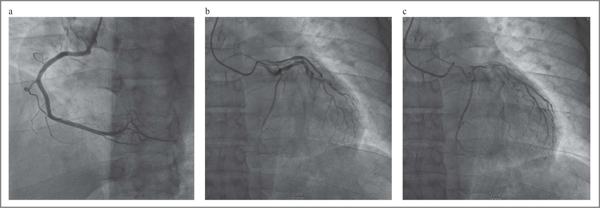 Рис. 2. Коронарография: a – правая коронарная артерия без значимых стенозов; b, c – вазоспазм ЛКА.