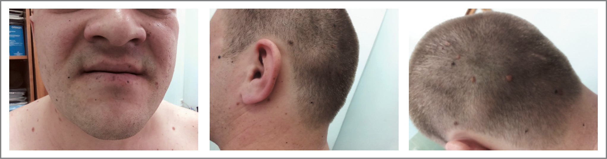 По данным объективного осмотра – состояние пациента удовлетворительное. Рост – 176 см, масса тела – 96 кг, индекс массы тела – 30,99 кг/м2. На коже лица головы, всей поверхности туловища и конечностей обнаружено большое количество папулезных высыпаний черного цвета, представленных на рис. 3, на поверхности губ – множество вкраплений черного цвета.