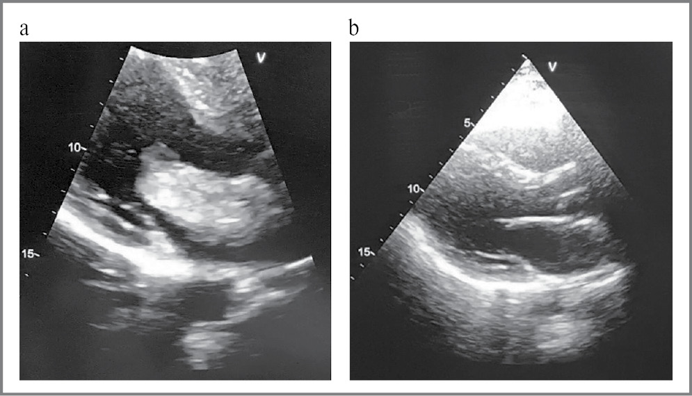 Рис. 4. ЭхоКС: а – миксома в области ЛП с пролабированием в полость ЛЖ; b – состояние после удаления миксомы.