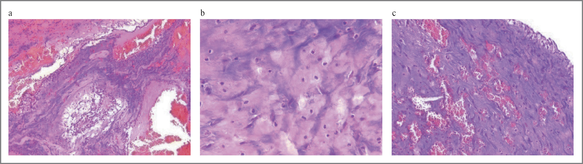 Fig. 6. Histological picture of myxoma: a – ×10; b, c – ×20.