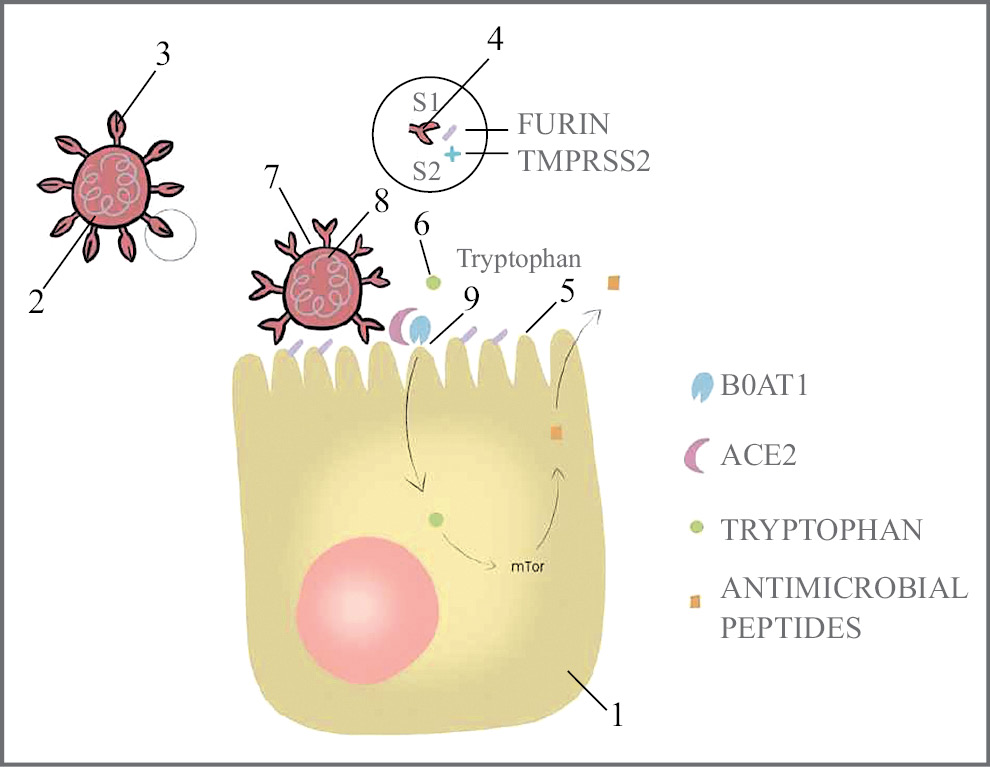 Примечание. 1 – энтероцит; 2 – SARS-CoV-2; 3 – S-skipe; 4 – S1 и S2 сегменты; 5 – щеточная кайма энтероцита; 6 – молекула триптофана; 7 – рецептор АПФ-2; 8 – рецептор B0AT1; 9 – антимикробная пептидаза.