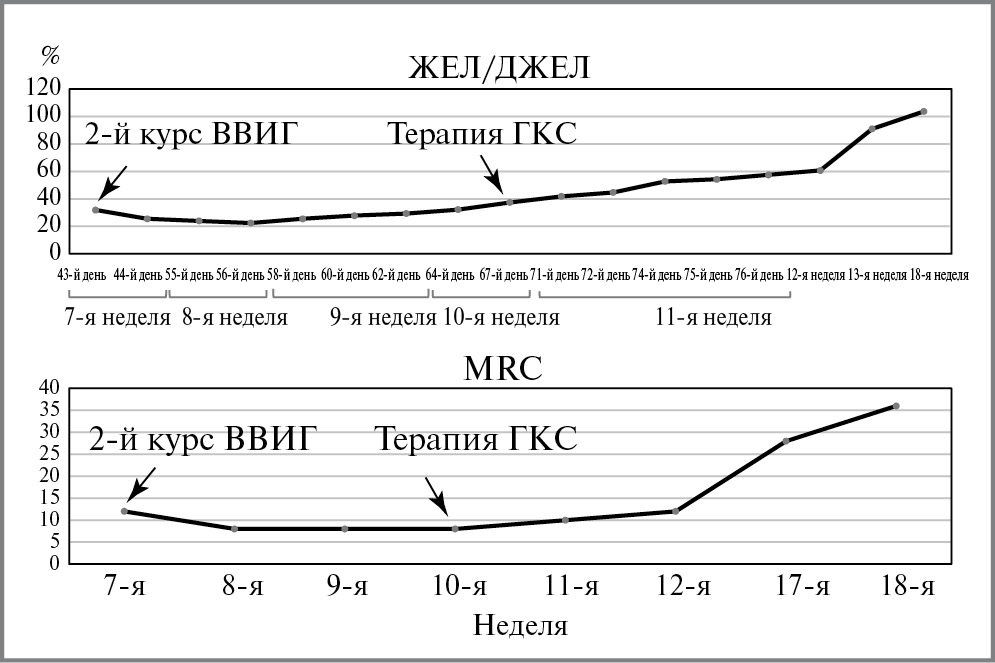 Учитывая прогрессирование симптоматики в течение более 4 нед (вплоть до 9-й недели болезни), а также данные динамического нейрофизиологического и сонографического исследований периферических нервов, на 11-й неделе заболевания диагноз был пересмотрен в пользу оХВДП (G61.8), в связи с чем принято решение о проведении лечения ГКС по схеме: пульс-терапия по 1 г ежедневно №5 с последующим переходом на пероральный прием из расчета 1 мг на 1 кг массы тела ежедневно. На фоне пульс-терапии метилпреднизолоном, уже после введения 2 г препарата, была зафиксирована положительная динамика в виде нарастания силы в мышцах шеи, плечевого пояса, субъективного облегчения дыхания. Объективно ЖЕЛ увеличилась с 22 до 45% от должного. По окончании пульс-терапии ГКС нарос объем движений в проксимальных группах мышц рук, стало возможным сгибание в локтевых суставах при разгрузке, увеличился объем движений в пальцах рук; в ногах сохранялась дистальная плегия с незначительным увеличением мышечной силы в проксимальных отделах.