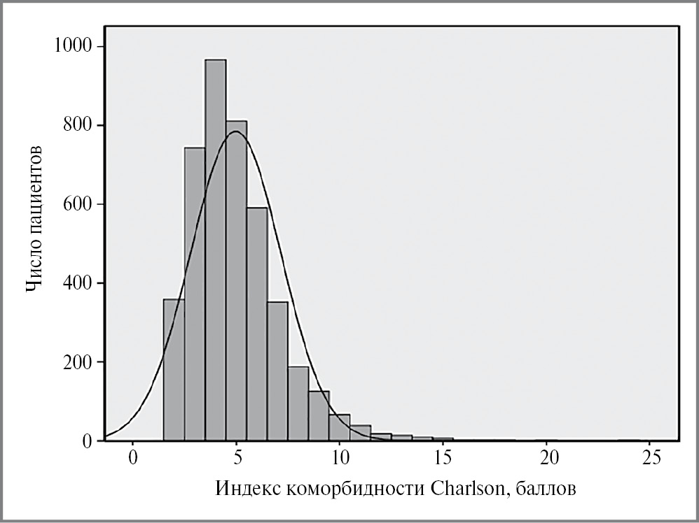 Наличие коморбидности оценили у 4296 (99,7%) из 4308 участников. Частота встречаемости коморбидной патологии составила 88,7%. Индекс коморбидности Charlson рассчитан у 4294 (99,7%) из 4308 пациентов в связи с тем, что полная информация о наличии хронических заболеваний, которые учитываются при расчете данного индекса, имелась у 4294 человек. У всех пациентов значения индекса коморбидности Charlson составляли 2–24 (медиана – 5, интерквартильный размах – 3–6); рис. 1.