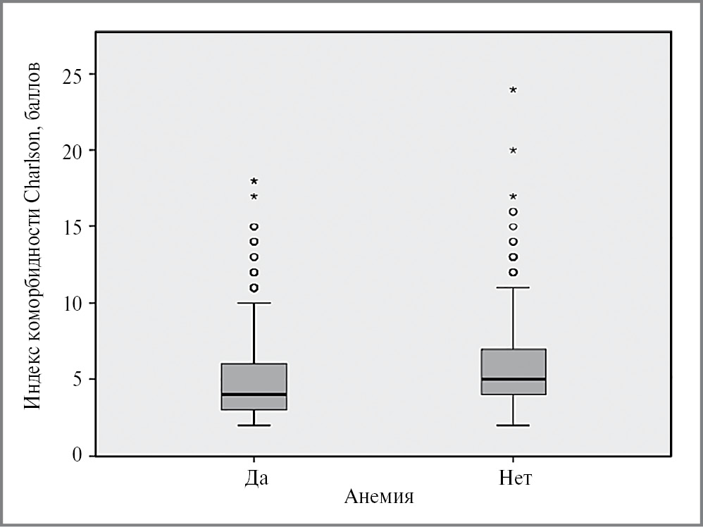 Рис. 2. Величина индекса коморбидности Charlson в зависимости от наличия или отсутствия анемии у лиц в возрасте ≥65 лет (n=4294).