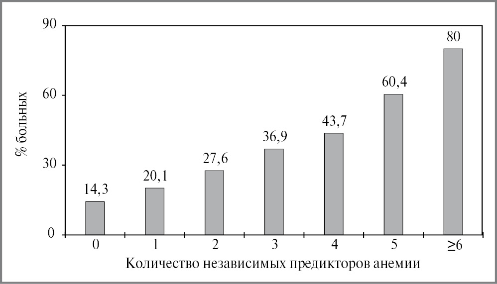 Работоспособность полученной модели проверили на этой же выборке пациентов, для чего оценили частоту анемии в зависимости от количества независимых предикторов ее наличия. Частота выявления анемии прогрессивно возрастала от 14% при отсутствии независимых предикторов до 80% при одновременном наличии у пациента ≥6 предикторов (рис. 3).