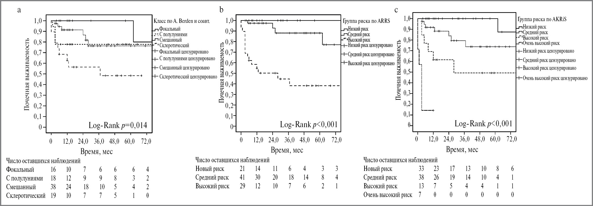 Рис. 1. Почечная выживаемость при различных гистопатологических классах АНЦА-ГН (a), а также в различных группах риска, стратифицированных по ARRS (b) и AKRiS (c).