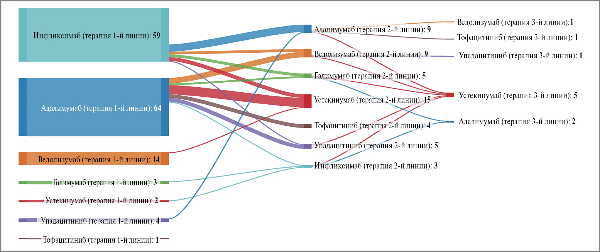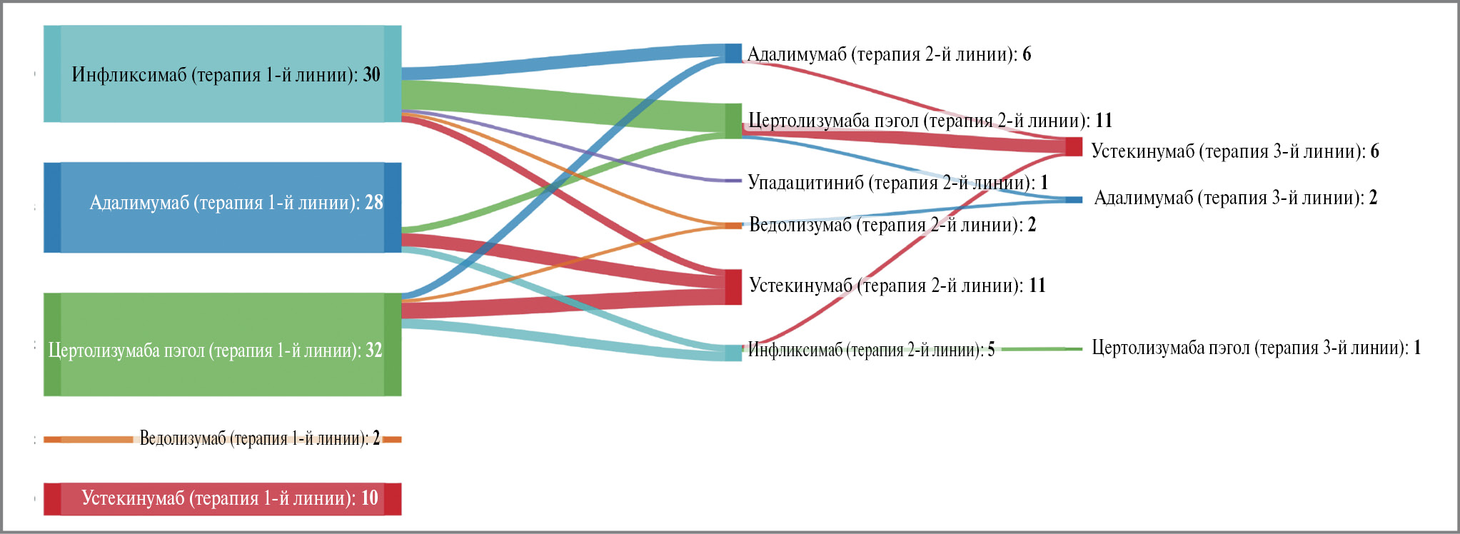 Последовательность переключения с различных препаратов у пациентов с БК представлена на рис. 1. В качестве терапии 1-й линии 102 пациентам с БК чаще назначали ингибиторы ФНО-α: цертолизумаба пэгол – 32 (31,4%) больным, инфликсимаб – 30 (29,4%), адалимумаб – 28 (27,5%). Устекинумаб и ведолизумаб назначали 10 (9,8%) и 2 (2%) бионаивным пациентам, которые в связи с малочисленностью исключены из анализа выживаемости терапии 1-й линии БК.