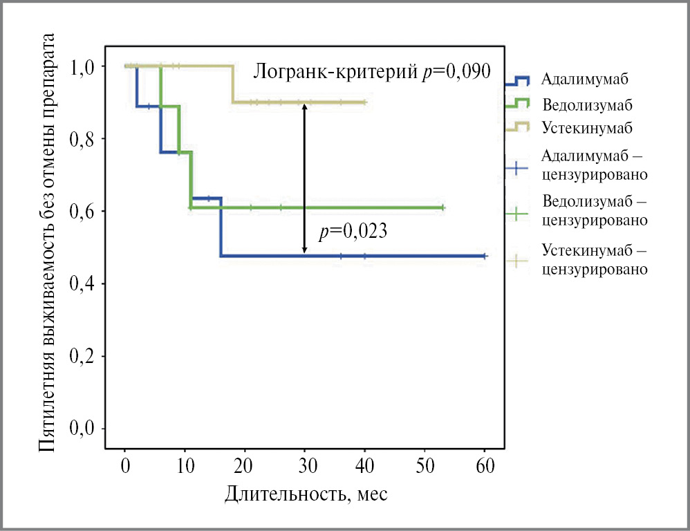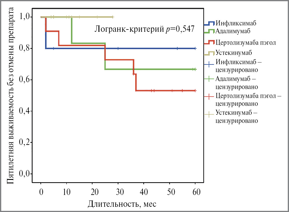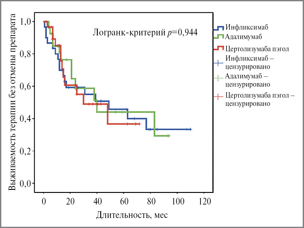 В изучаемой нами когорте в качестве терапии 1-й линии наиболее часто использованы ингибиторы ФНО-α – в общей сложности у 88,7% пациентов, поскольку данные препараты первыми появились в клинической практике. Нами не получено различий в выживаемости терапии 1-й линии инфликсимабом, адалимумабом и цертолизумабом пэгол у пациентов с БК в период наблюдения, медиана которого составила 16 (7; 39) мес. При этом пациенты, получавшие различные ингибиторы ФНО-α в терапии 1-й линии, были сопоставимы по основным клиническим характеристикам, за исключением меньшей частоты курения при лечении инфликсимабом и малого числа перианальных форм среди пациентов, получающих цертолизумаба пегол. Через 6 мес и 1 год лечения число пациентов на терапии инфликсимабом было незначительно ниже по сравнению с другими ингибиторами ФНО-α. Однако через 3 года наблюдения 1/2 пациентов сохранили в качестве терапии инфликсимаб, в то время как другие сравниваемые препараты имели тенденцию к снижению выживаемости, в большей степени – цертолизумаба пегол.