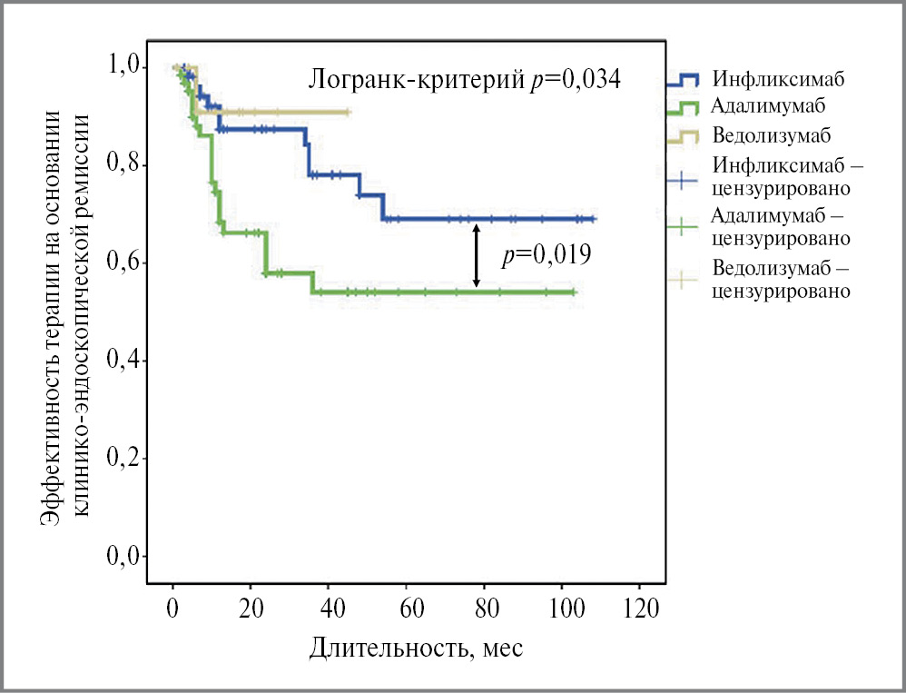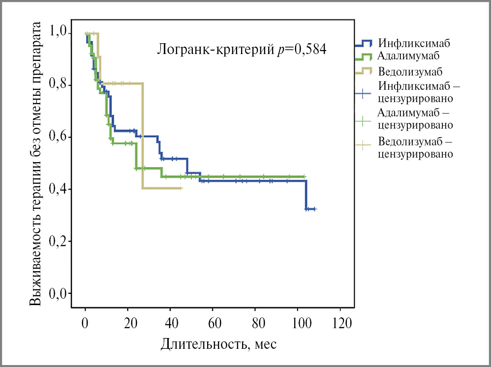 Первичными конечными точками исследования стали оценка выживаемости и оценка эффективности терапии. Под выживаемостью терапии подразумевалось время от начала ГИБТ до ее прекращения по любым причинам. Относительные показатели выживаемости терапии в процентах рассчитаны в зависимости от продолжительности наблюдения за пациентами, которая составляла 6, 12, 24 и 36 мес при условии наблюдения за исследуемыми на протяжении указанного периода времени. Под эффективностью терапии подразумевалась клиническая или клинико-эндоскопическая ремиссия заболевания на фоне ГИБТ или приема ТИС. Оценка вторичных конечных точек исследования подразумевала анализ причин смены или отмены ГИБТ или ТИС. Статистический анализ производили с использованием программы IBM SPSS Statistics, версия 19. Нормальность распределения определяли с использованием критерия Колмогорова–Смирнова с поправкой Лиллиефорса. Количественные переменные представлены как медиана (Ме) и интерквартильный интервал (ИИ), категориальные переменные выражены в виде абсолютных значений и процентных долей. Сравнение номинальных данных проводили при помощи критерия χ2 Пирсона. При сравнении нескольких выборок количественных данных, имеющих распределение, отличное от нормального, использовали критерий Краскела–Уоллиса, а в случае обнаружения статистически значимых различий между группами выполняли парное сравнение совокупностей при помощи апостериорного критерия Данна. Для сравнительной оценки выживаемости и эффективности терапии построены кривые Каплана–Мейера, а различия в распределениях между препаратами сравнивались с использованием логранк-критерия. К цензурированным относили те данные, которые на момент включения в исследование не достигли изучаемой конечной точки [4]. Значение p<0,05 считали статистически значимым.