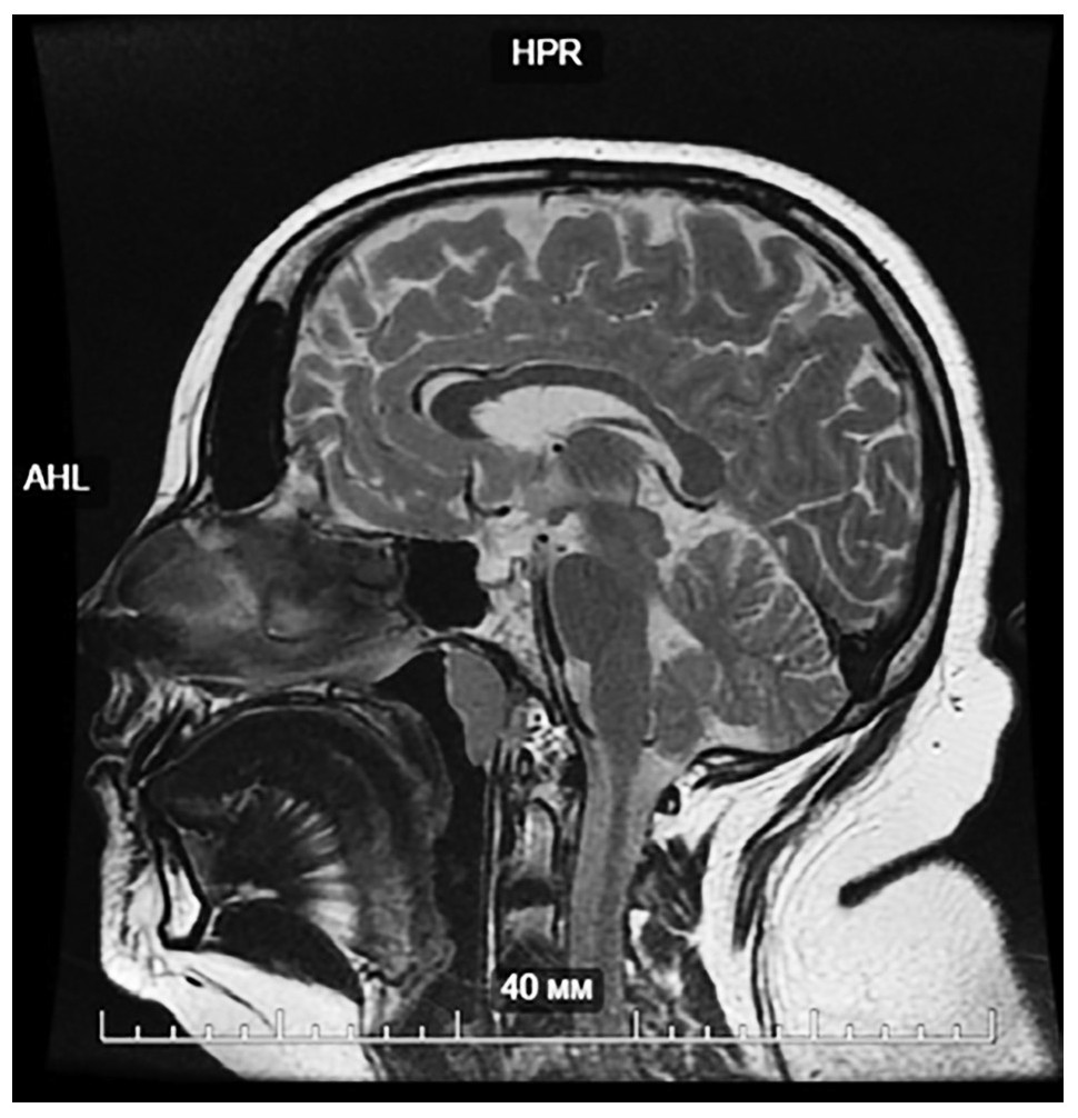 Fig. 1. Magnetic resonance imaging of the hypothalamic-pituitary region with contrast, T2-weighted image, sagittal projection. The substance of the adenohypophysis is located in the form of a thin strip of uniform thickness along the bottom of the sella turcica, the upper contour of the gland is smooth, concave. The substance of the pituitary gland reaches a maximum thickness of 2.4 mm. The pituitary infundibulum is determined in the sagittal plane. The chiasm is determined, not deformed. The suprasellar cistern is significantly expanded, prolapses into the cavity of the sella turcica.