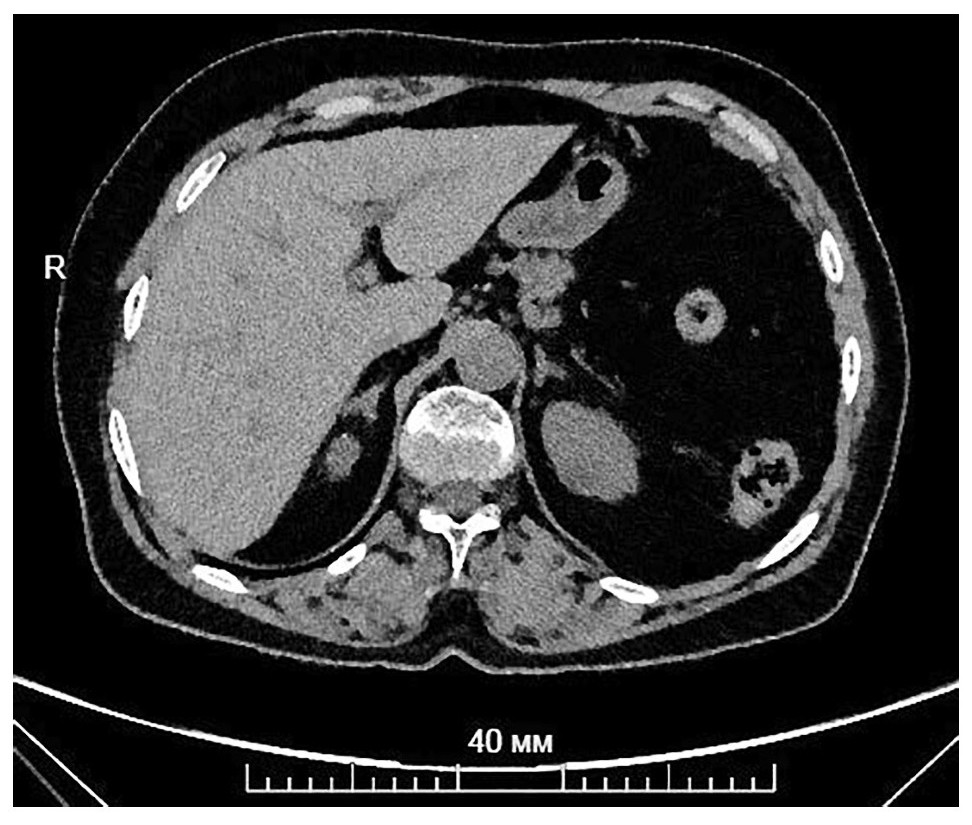 Fig. 2. Multispiral computed tomography of abdominal organs with contrast. Adrenal glands: usually located, diffusely thickened, density in the native phase – 28 HU, in the arterial phase – 97 HU, in the venous phase – 111 HU, in the excretory phase – 62 HU.