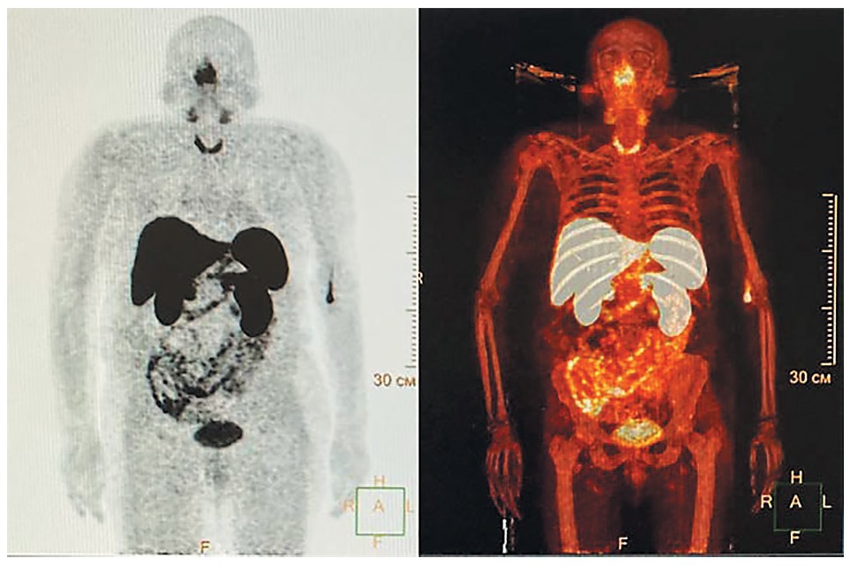 Рис. 3. ПЭТ-КТ с 68Ga-DOTA-TATE, 6 мес после двусторонней адреналэктомии. Признаков 68Ga-DOTA-TATE-позитивной опухоли не выявлено; негативное образование в S1/2 доли левого легкого (гамартома?); негативные неравномерные участки уплотнения S6 правого и S9 левого легкого; негативное образование в правой доле щитовидной железы; кисты почек.