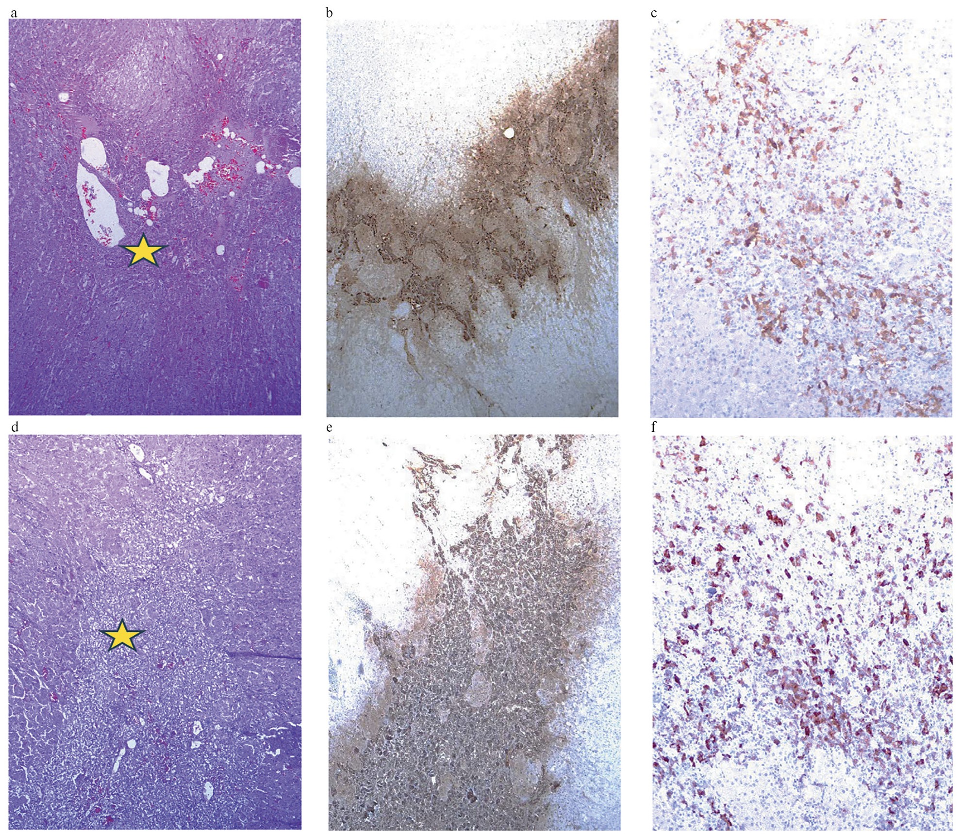Рис. 4. Правый (a–c) и левый (d–f) надпочечники. Мозговое вещество правого надпочечника имеет нечеткие контуры (a, отмечено звездочкой), а мозговое вещество левого надпочечника утолщено и гиперплазировано (d, отмечено звездочкой). Окраска гематоксилином и эозином, ув. 40. Экспрессия хромогранина А в клетках мозгового вещества правого (b) и левого (e) надпочечников, ув. 125. АКТГ-секретирующие клетки, диффузно распределенные в мозговом веществе правого (c) и левого (f) надпочечников, ув. 250.