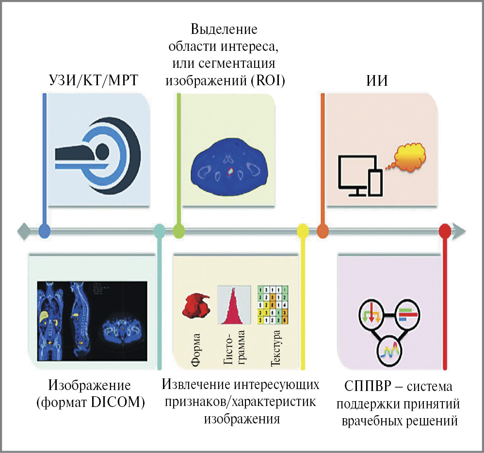 После получения и реконструкции медицинских изображений область интереса (ROI – region of interest) сегментируется вручную, полуавтоматически или автоматически. Например, если ROI является почка, то ее контур должен быть «очерчен» на КТ-снимках каждого среза. Далее происходит извлечение интересующих признаков, в том числе с помощью ИИ, для выработки системы поддержки принятия клинических решений.