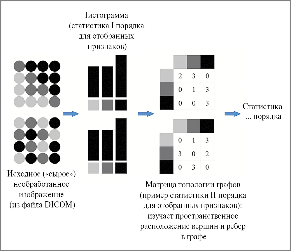 Видно, что 2 разных необработанных изображения имеют одинаковое количество черных, темно-серых, серых и светло-серых пикселей (элементарных частей изображения), при этом в статистике I порядка они же имеют одинаковые гистограммы, с одной стороны. С другой стороны, статистика II порядка и более высоких порядков учитывает горизонтальное «взаимоотношение» пикселей, что находит отражение в различных матрицах (3-й столбец на рисунке). Данный рисунок показывает, что статистика I порядка не принимает во внимание взаиморасположение пикселей, в то время как статистика II порядка и более высоких порядков учитывает горизонтальное, вертикальное и пространственное взаиморасположение пикселей, что лучше демонстрирует гетерогенность изучаемой структуры/ткани/органа и т.д.