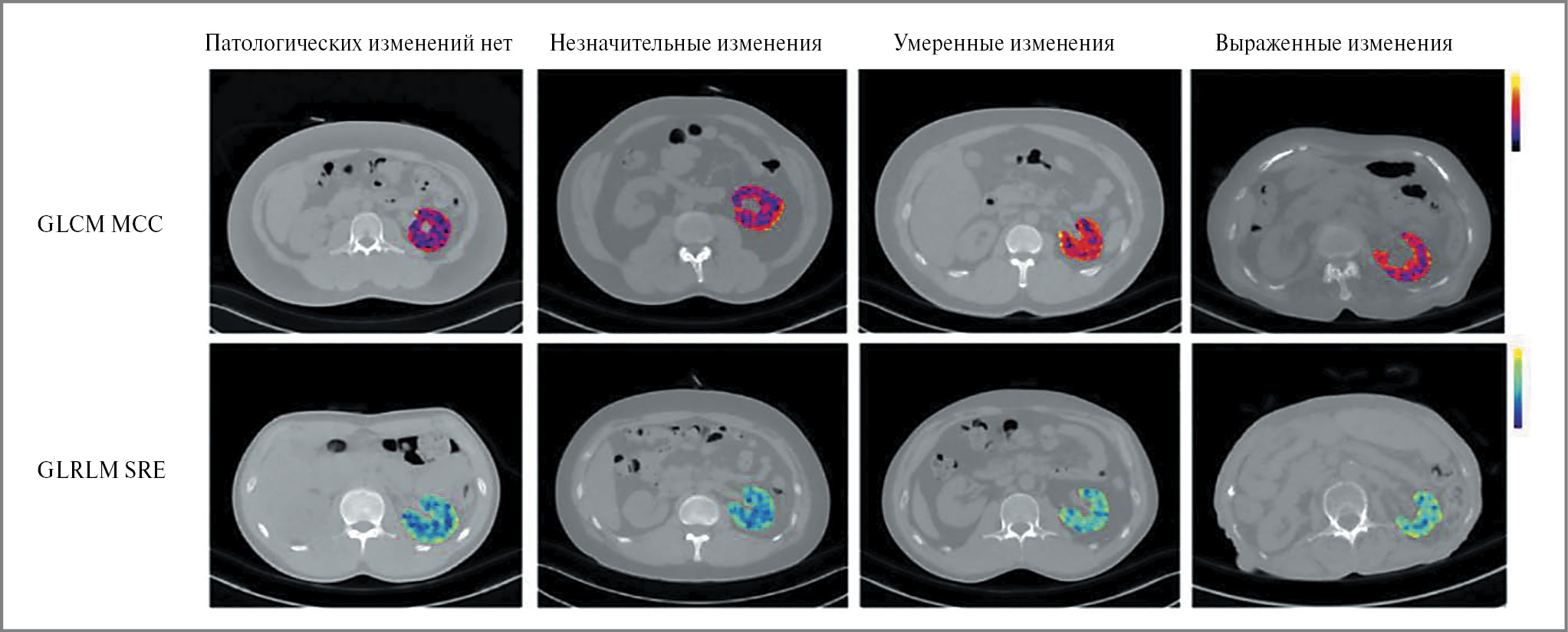 С помощью PyRadiomics проведен отбор радиомических признаков, включая форму, текстуру I и высшего порядков. Всего в анализ включено 1226 радиомических признаков (17 признаков формы, 236 признаков I порядка и 973 высокопорядковых текстурных признака, включая 5 наиболее сильно коррелирующих – NGTDM, GLDM, GLSZM, GLCM и GLRLM). Извлеченные радиомические признаки объединены в несколько групп: признаки, отражающие изменения во всей паренхиме («общепаренхиматозные»), и те, которые наблюдались исключительно в корковом слое почки. В целом радиомические признаки (NGTDM, GLDM, GLSZM, GLCM и GLRLM), извлеченные из общего «массива» паренхимы («общепаренхиматозные»), показали более высокие корреляции с гистологическими изменениями (Rs=0,36–0,42) в сравнении с показателями, извлеченными только в корковом веществе (Rs=0,24–0,38). Корреляции «общепаренхиматозных» радиомических признаков с величиной ИХ были более существенными, чем с выраженностью ИФ, АТ и ГС. В то же время между степенью поражения почки и, например, ее максимальной длиной корреляция была относительно низкой. Коэффициенты корреляции для размера почки по длинной оси варьировали от -0,25 до -0,10. Кроме того, объем почки демонстрировал слабую взаимосвязь с наличием ИФ, атрофией канальцев и суммой баллов по шкале ИХ (Rs=-0,20, -0,17 и -0,28 соответственно). Наряду с этим установлена связь между наиболее значимыми радиометрическими признаками (GLCM и GLRLM) и степенью изменения вещества почки по данным гистологической полуколичественной шкалы (ИФ, ТА или ГС). Для наглядности созданы воксельные карты высокопорядковых текстурных признаков для лучшего понимания их пространственного распределения. С увеличением балла по полуколичественной шкале в паренхиме распределялось больше вокселей высокой интенсивности с особенно яркими сигналами по наружному контуру почки (рис. 3), т.е. обнаружено, что текстурные признаки, сильно коррелирующие с хроническими поражениями, были интенсивно распределены вокруг краев почек на воксельных картах радиомики.