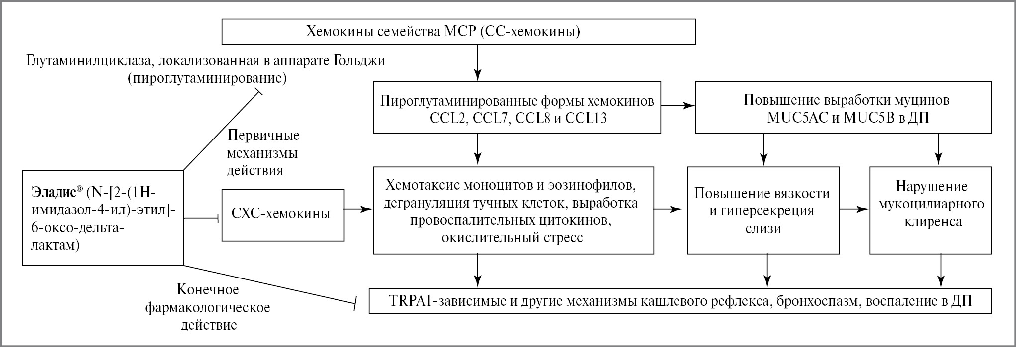 За счет подавления функции Гольджи-резидентной глутаминилциклазы – фермента, который катализирует пироглутаминирование CC-хемокинов семейства MCP, Эладис® предотвращает образование их активных форм. Пироглутаминированные хемокины, такие как CCL2, CCL7 и CCL8, обладают повышенной стабильностью и аффинностью к рецепторам, что усиливает их провоспалительные свойства [8]. Эти хемокины в свою очередь способствуют активации TRPA1-каналов на сенсорных нейронах ДП напрямую или через стимуляцию иммунных клеток (например, тучных клеток и эозинофилов), которые высвобождают медиаторы (например, простагландины и аденозинтрифосфат), активирующие TRPA1 [16, 22]. TRPA1 играет ключевую роль в передаче кашлевого сигнала, особенно при воспалительных состояниях, что подтверждено исследованиями на моделях in vivo и in vitro [16]. Так, I. Mukhopadhyay и соавт. (2014 г.) продемонстрировали, что ингибирование TRPA1 снижает гиперчувствительность кашлевых рецепторов, что делает этот канал перспективной мишенью для противокашлевой терапии [16].