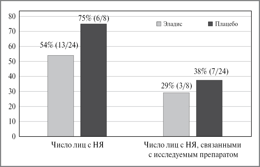 Рис. 2. Доля участников (%), получавших Эладис®* или плацебо, у которых зарегистрированы НЯ. *Представлены данные в объединенной выборке (n=24) из 3 групп участников, принимавших Эладис® в дозах 10, 50 и 200 мг.
