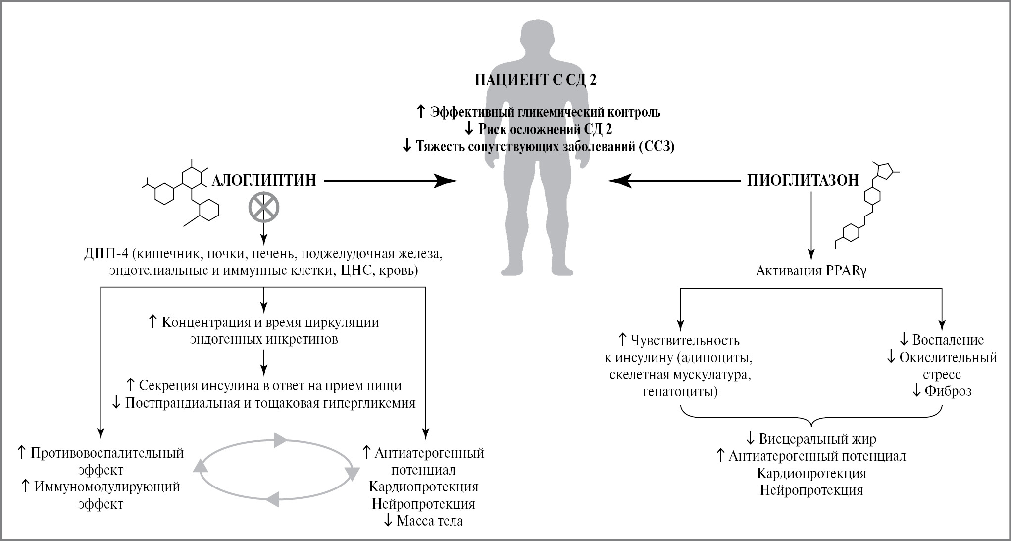 В отношении комбинированной ССТ необходимо отметить такое актуальное направление, как использование фиксированных комбинаций ГП (ФКГП), позволяющих значимо повысить приверженность пациентов лечению, снизить расходы на фармакотерапию и улучшить клинические исходы [21, 22]. Одной из последних ФКГП является комбинация иДПП-4 алоглиптина (Ало) и тиазолидиндиона пиоглитазона (Пио).