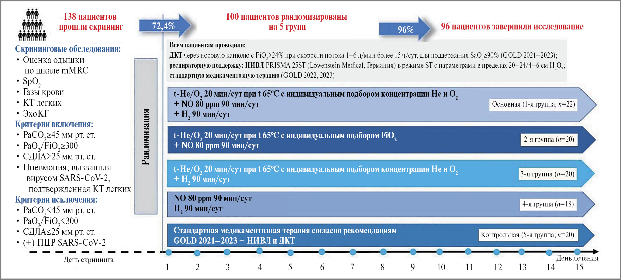 Цель исследования – изучение эффективности и безопасности комплексного применения t-He/O₂, NO и H₂ у пациентов с обострением ХОБЛ, осложненной гипоксемической, гиперкапнической ДН и вторичной легочной артериальной гипертензией – ЛАГ (III группа ЛАГ согласно классификации Всемирной организации здравоохранения) в постковидном периоде.
