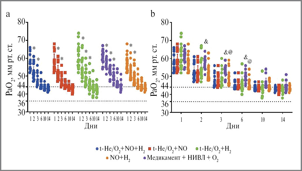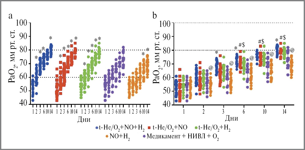 Рис. 3. Динамика PaO₂ в 1, 2, 3, 6, 10 и 14-й дни: a – внутригрупповое сравнение, здесь и далее на рис. 4, 5: *каждый последующий день в сравнении с днем предыдущего измерения (p<0,05); b – межгрупповое сравнение во 2-й день: @медикамент + НИВЛ + O₂ в сравнении с t-He/O₂+NO+H₂ в 3-й день: *t-He/O₂+NO+H₂ в сравнении с t-He/O₂+NO, NO+H₂, медикамент + НИВЛ + O₂, @медикамент + НИВЛ + O₂ в сравнении с t-He/O₂+NO, t-He/O₂+H₂; в 6, 10 и 14-й дни: *t-He/O₂+NO+H₂ в сравнении с NO+H₂, медикамент + НИВЛ + O₂, #t-He/O₂+NO в сравнении с NO + H₂, медикамент + НИВЛ + O₂, @медикамент + НИВЛ + O₂ в сравнении с t-He/O₂+H₂ (p<0,05).