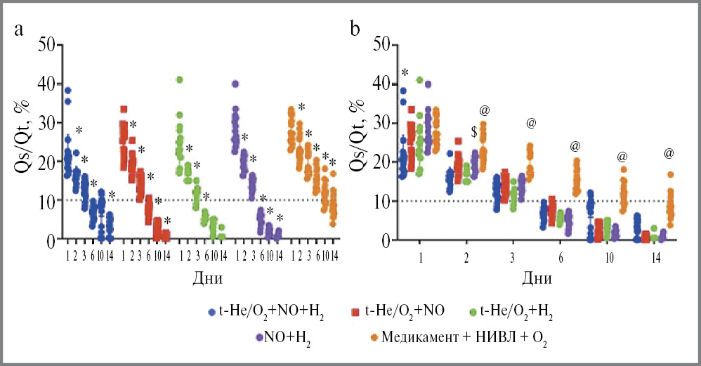 Fig. 5. Change of intrapulmonary shunt fraction on Days 1, 2, 3, 6, 10, and 14: a – intragroup comparison; b – intergroup comparison on Day 1: *t-He/O₂+NO+H₂ compared to all other groups; on Day 2; $NO+H₂ compared to t-He/O₂+NO+H₂, t-He/O₂+NO, t-He/O₂+H₂; @medication+NIV+O₂ compared to all other groups and on Days 3, 6, 10, and 14: @medication+NIV+O₂ compared to all other groups (p<0.05).