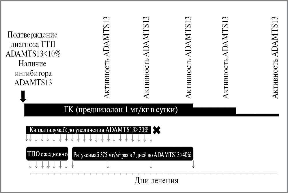 Таким образом, мониторинг активности ADAMTS13 позволяет индивидуализировать «триплет-терапию» у пациентов с иТТП. Интеграция каплацизумаба в терапию ТПО и ГК позволяет сократить время до восстановления числа тромбоцитов, оборвать гемолиз, избежать угрожающих жизни осложнений. ТПО прекращают при увеличении числа тромбоцитов > 150 × 109/л. Ритуксимаб начинают после прекращения ТПО. Терапия каплацизумабом должна быть прекращена при достижении активности ADAMTS13 > 20%. Терапия ритуксимабом и ГК должна продолжаться до тех пор, пока активность ADAMTS13 в плазме крови составит > 40%, после чего ритуксимаб может быть отменен и начато уменьшение дозы ГК. При неэффективности терапии ритуксимабом может рассматриваться 2-я линия терапии бортезомибом, а при его неэффективности – моноклональным антителом против CD38.