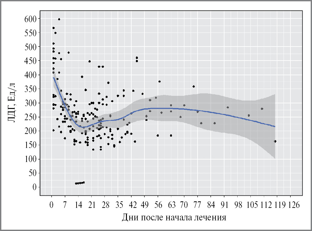 Рис. 2. Изменения активности ЛДГ сыворотки при лечении иТТП.
