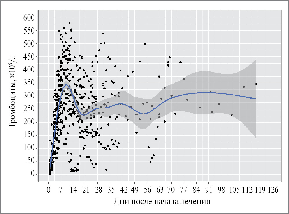 Медиана времени от начала терапии каплацизумабом до восстановления числа тромбоцитов составила 4 (МКИ 3–4,5) дня. При этом плазменная активность ADAMTS13 у большинства пациентов оставалась < 10%. Повышение активности ADAMTS13 > 20% состоялось у пациентов лишь спустя от 5 до 111 дней (медиана 23, МКИ 12–31 день). До восстановления числа тромбоцитов > 150 × 109/л пациентам проведено от 2 до 14 процедур ТПО (медиана – 4, МКИ 3–5), у каждого пациента заменено от 4277 до 35 544 мл плазмы (медиана 11 395, МКИ [7241–1634] мл). Изменение числа тромбоцитов в течение первых 2 нед носило волнообразный характер: после начала терапии каплацизумабом оно быстро увеличилось, и у большинства больных наблюдался тромбоцитоз, затем число тромбоцитов нормализовалось (рис. 3).