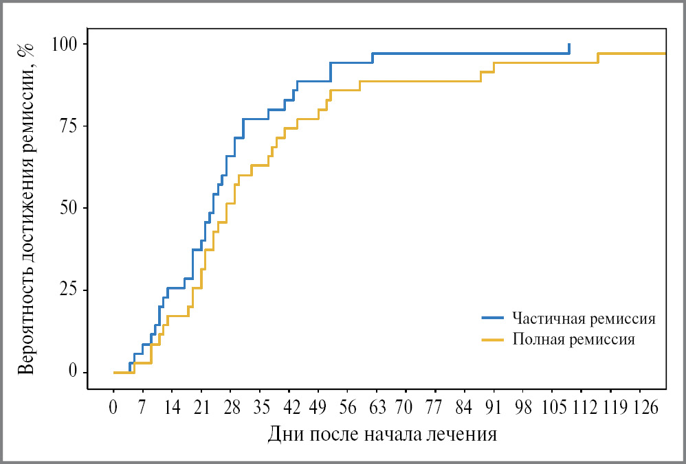 Частичная ремиссия достигнута у всех 35 пациентов, у 8 пациентов при очередном еженедельном измерении активность ADAMTS13 повысилась до значений > 40% и сразу констатирована полная ремиссия, минуя этап частичной ремиссии. Медиана времени достижения частичной ремиссии составила 20 (МКИ – 11–32) дней (рис. 4).