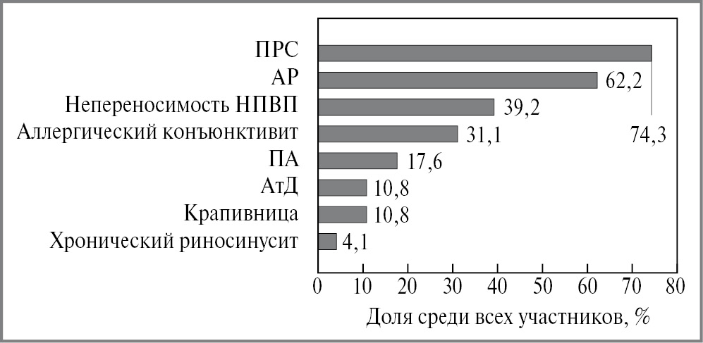 Большая часть исследуемой российской популяции – женщины (60,8%), старше 40 лет (73,0%), со средним индексом массы тела (МТ) 26,71 кг/м². Средний возраст постановки диагноза БА – 34,3 года. Отмечены относительно высокие уровни эозинофилов крови (0,460×109 клеток/л), 74,3% имели сопутствующий ПРС, 39,2% – непереносимость НПВП. Обострения чаще провоцировали неаллергические триггеры (инфекции, физическая нагрузка). Выявленные характеристики пациентов соотносятся с фенотипом тяжелой эозинофильной астмы с поздним дебютом, неоднократно описанным в литературе [4–6].