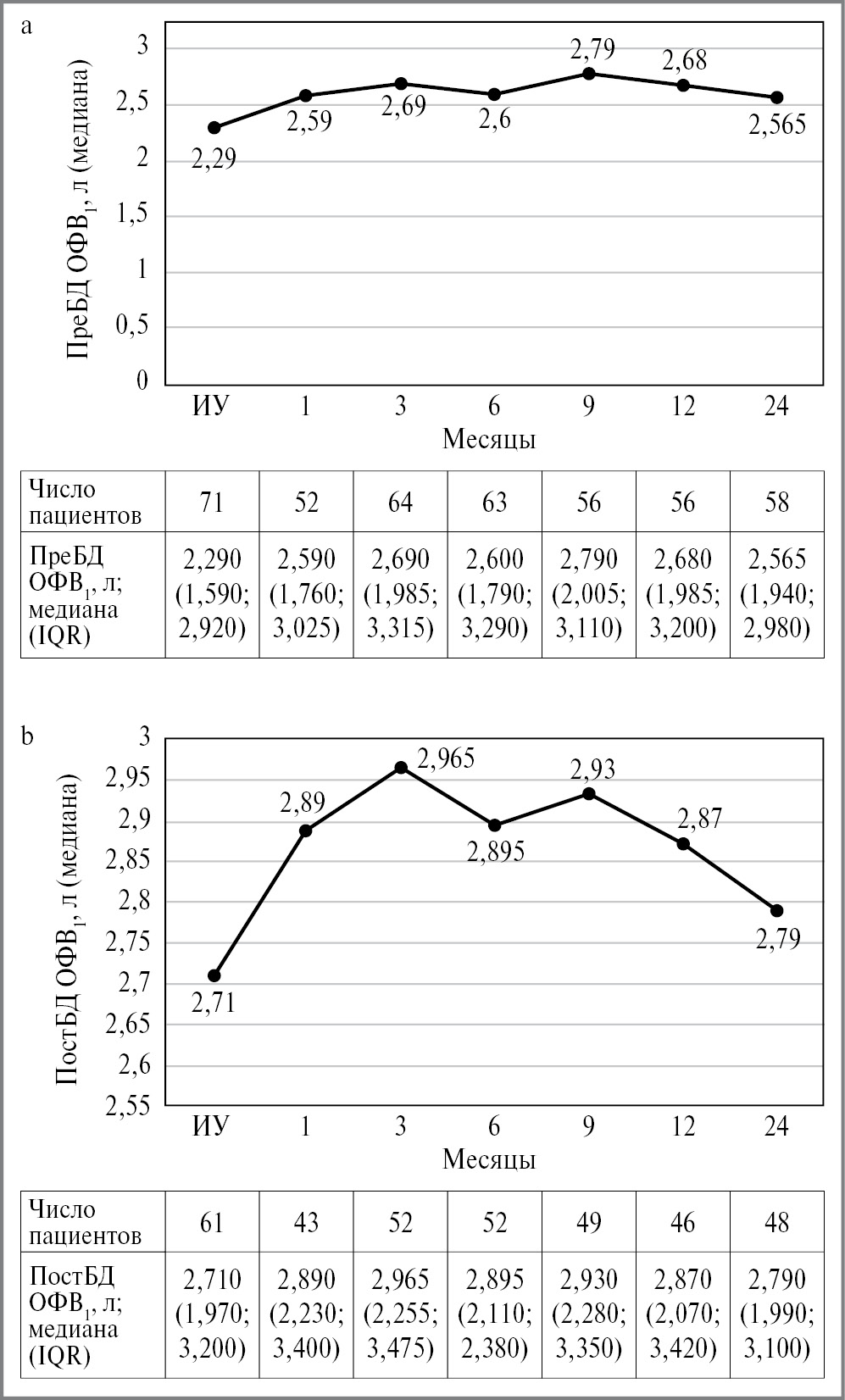 Рис. 2. Изменение показателей функции внешнего дыхания: a – преБД ОФВ1; b – постБД ОФВ1.
