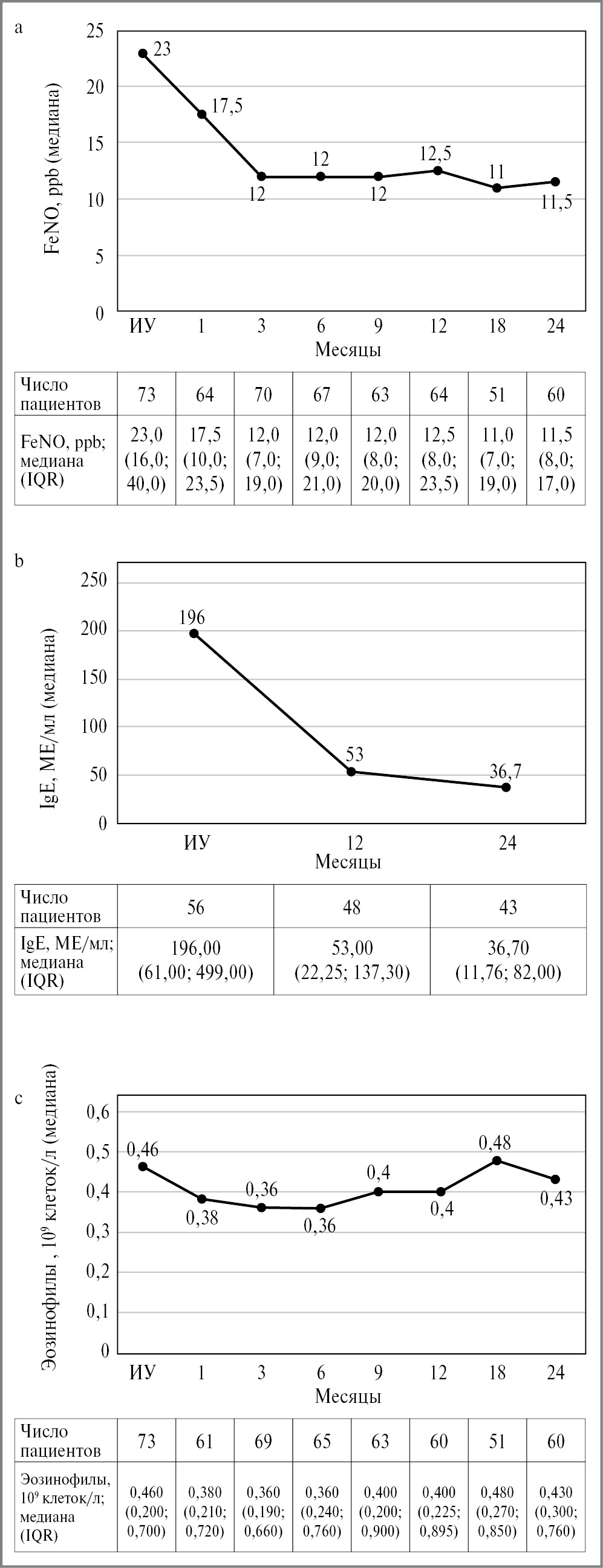 - снижение уровней воспалительных биомаркеров. Отмечена тенденция к снижению FeNO с течением времени (рис. 3, a), с наиболее выраженным снижением FeNO к 3-му месяцу исследования: 12,0 ppb (IQR 7,0; 19,0), т.е. -12,0 ppb (-62,5%) от ИУ, медианное значение на 24-м месяце: 11,5 ppb (IQR 8,0; 17,5), т.е. -11,5 ppb или -52,7% от ИУ. Снижение концентрации общего IgE крови наблюдали на протяжении всего исследования (рис. 3, b): 53,00 МЕ/мл (IQR 22,25; 137,30) через 12 мес лечения, 36,70 МЕ/мл (IQR 11,76; 82,00) – через 24 меc. Наблюдали относительно стабильные значения общего количества эозинофилов с тенденцией к снижению в процессе лечения (рис. 3, c), незначительное увеличение показателя выявлено на 18-м месяце (0,480×109 клеток/л, IQR 0,270; 0,850), с постепенным снижением к 24-му месяцу (0,430×109 клеток/л, IQR 0,300; 0,760).